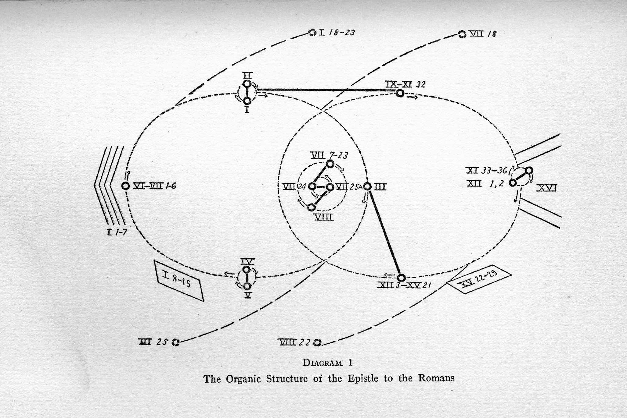 It is very hard to express this in words, and I do not know how it can be done adequately, for the subject matter is life not logic. But in making the attempt I want to use this diagram (diagram 1). Perhaps you will laugh at it, but at any rate, it will be a peg on which to hang my remarks. Somebody told me that it looks like an insect. I asked why, "Because those things look like antennae." I said, "Antennae don't grow out of the body, they grow out of the head." However, I am not entirely displeased if it looks something like an insect, because I feel that this epistle cannot be depicted only by somehing which is alive. Of couse I do not think that the diagram actually depicts the structure of the epistle, but I think at least that you will find it useful as an aid in following my words, just as I found it useful.