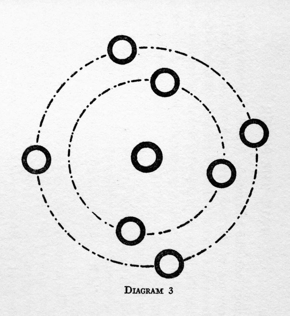 This diagram is based on one of the current conceptions of the structure of an atom. According to this conception an atom consists of a proton, a positive charge of electricity, around which revolve a number of electrons, negative charges of electricity, somewhat as planets revolve around the sun. The proton is the sun, the electrons are the planets. The electrons may be conceived in one orbit as in digaram 2. Or they may be conceived as grouped into two orbits, as in diagram 3. This represents in a rough way the structure of the epistle to the Romans. I have used a proton and two orbits of electrons rather than one orbit, because the epistle naturally divides itself into three parts, addressed severally to our three centres or foci of attention.